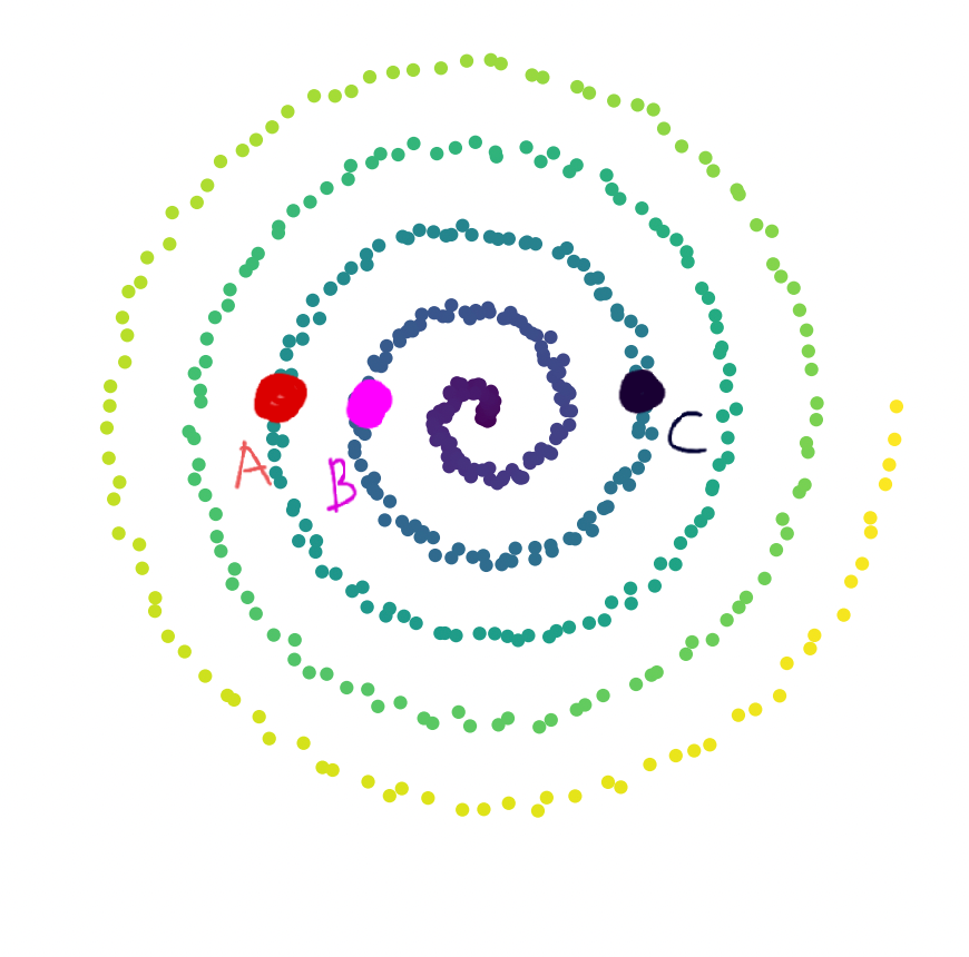 Geodesic distance is the distance along the manifold. If we start walking along the 1-dimensional manifold, starting from the center of the spiral, \(B\) comes first, followed by \(C\) and \(A\). Therefore, \(A\) is farther from \(B\) than \(C\) is from \(B\) along the manifold.