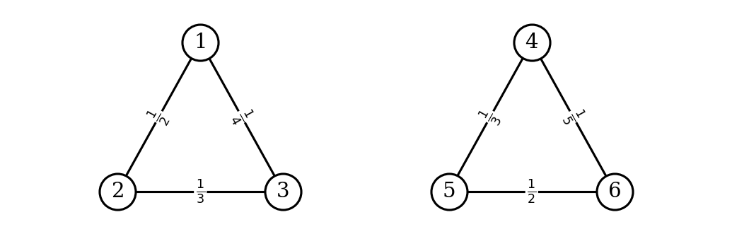 When we think of the cost of this embedding with respect to the Laplacian Eigenmaps cost function, we see that the cost is zero. This is because any term where \(W_{ij} > 0\) comes from two nodes in the same connected component, and for them \(f_i = f_j\), so \((f_i - f_j)^2 = 0\). For any pair of nodes, one in the first component and one in the second, \(W_{ij} = 0\), so they do not contribute to the cost, no matter what their \(f\) values are.