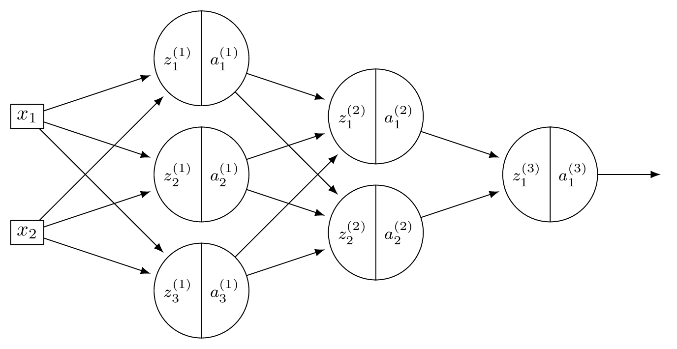 \(z_1^{(1)} = 3(2) + (-1)(0) + (-1)(-2) = 8\), so \(a_1^{(1)} = \text{ReLU}(8) = 8\).